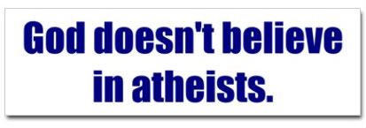 I've seen this bumper sticker dozens of times before, but this is the first time I've seen it since coming to terms with the fact that I am an atheist. At first I thought, "What the hell does that even mean?" Then, waiting at a red light behind this van, I thought: "this bumper sticker is a criticism of me and people like me." Theists look down on atheists. I have a friend who discovered recently that a client of his now refuses to do business with him any longer because she found out "the terrible truth" that he's an atheist. I wish I could say that such judgmental behavior from theists is rare, but I can't. This is what passes for "Christian love" these days, and it's pathetic.