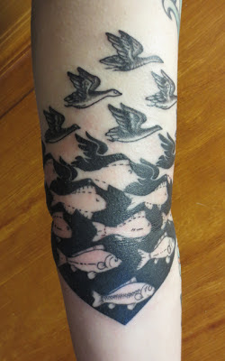This following one is a variation of a Escher print. I love the placement of it, where the arm bends. As you can see from the photo this is fresh and the arm is swollen in places.