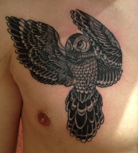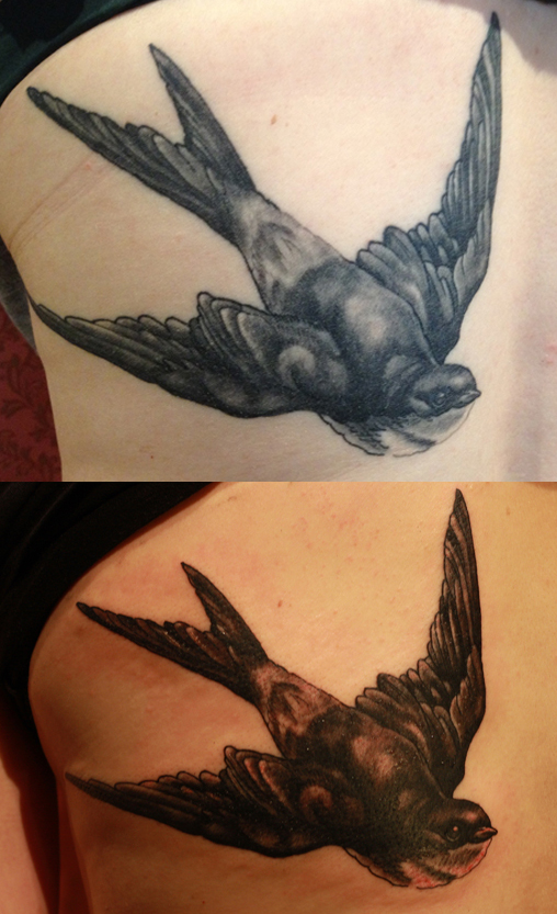 This first tattoo I've posted before, now I have a new picture of it when it's healed. The healed one is on top. B&G pictures heal lighter and it's hard to get a good picture of them when they are fresh. This bird was done after a picture the client brought in. (there's a big difference in the warm/cool light in these photos too, but I think you get the picture)
